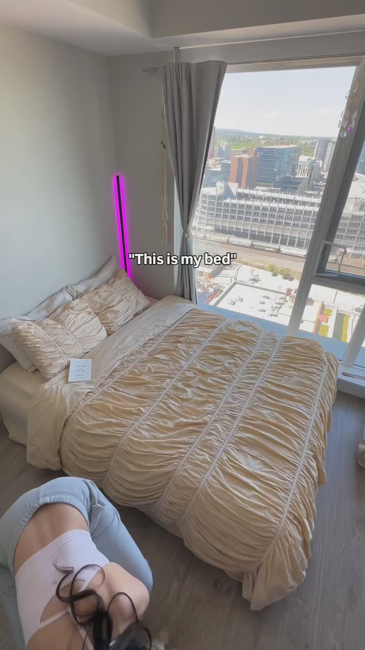 Close-up aerial view of the VibeCore Royal Pleated Bedding Set, highlighting the intricate pleated details and luxurious 100% cotton fabric, offering a soft and chic addition to any bedroom or dorm.